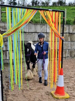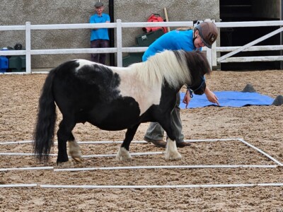After lunch Melanie gave us an amazing demonstration of Horse Agility using our ponies Bruno and KitKat. Afterwards our human participants were invited to try their hand at leading the ponies, calmly and gently, around the maze, through the waving fronds of a doorway and around the ‘scary corner’, where there were unfamiliar waving, moving and shiny objects.
