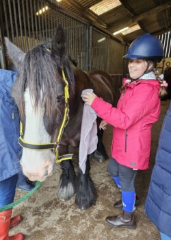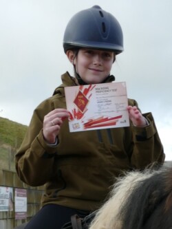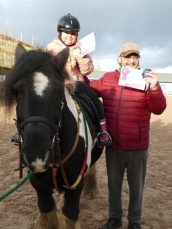 Excellent grooming took place, and Holly did a splendid job of poo-picking and sweeping up. Some riders managed short rides on Noddy or on Blue, and certificates and rosettes (wrapped in waterproof cases) were handed out to all our excellent riders.