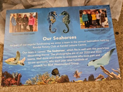December saw the return of the Annual Christmas Tree Festival at Kendal Parish church. The theme this year was ‘Under the sea’, so our riders and helpers made beautiful marine decorations – we had fish, jellyfish, and of course, seahorses. Those who have read through the other sections of the review will know ‘The Seahorses’ is our team name when we enter the annual Swimathon (another of the charity events which help us to fund our group) so we made sure to include some pictures of our brilliant swimmers from the last couple years!