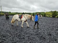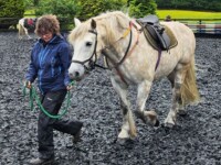Braving the inclement weather we went out into the arena to lead the ponies round and accustom them to side-walkers. Shirley our volunteer ‘child’ bravely mounted one soaking saddle after another dismounting forwards so the ponies became used to some of the strange ways of RDA.