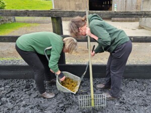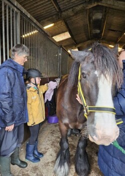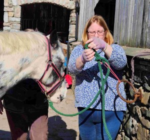 On Tuesday, 18 March we held our first volunteer training session of the year at Larkrigg. Rebecca Kemp, our County Chair, led the session, ably assisted by our very patient pony, Blue. We learned a technique for tying the pony up with a quick release knot. Then came tacking up. Rebecca demonstrated her favourite method of attaching reins to the bridle correctly by wearing it! Afterwards, the volunteers were given the opportunity to have a go at tacking up.