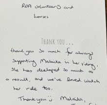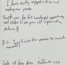 Our riders mean a lot to us, so it was lovely to receive these messages from our riders and their parents on their last session with us this term. Whilst we look forward to welcoming new children who will benefit from riding with our group next term, will really miss those who won’t be returning. Click on the card or letter to see the whole thing.
