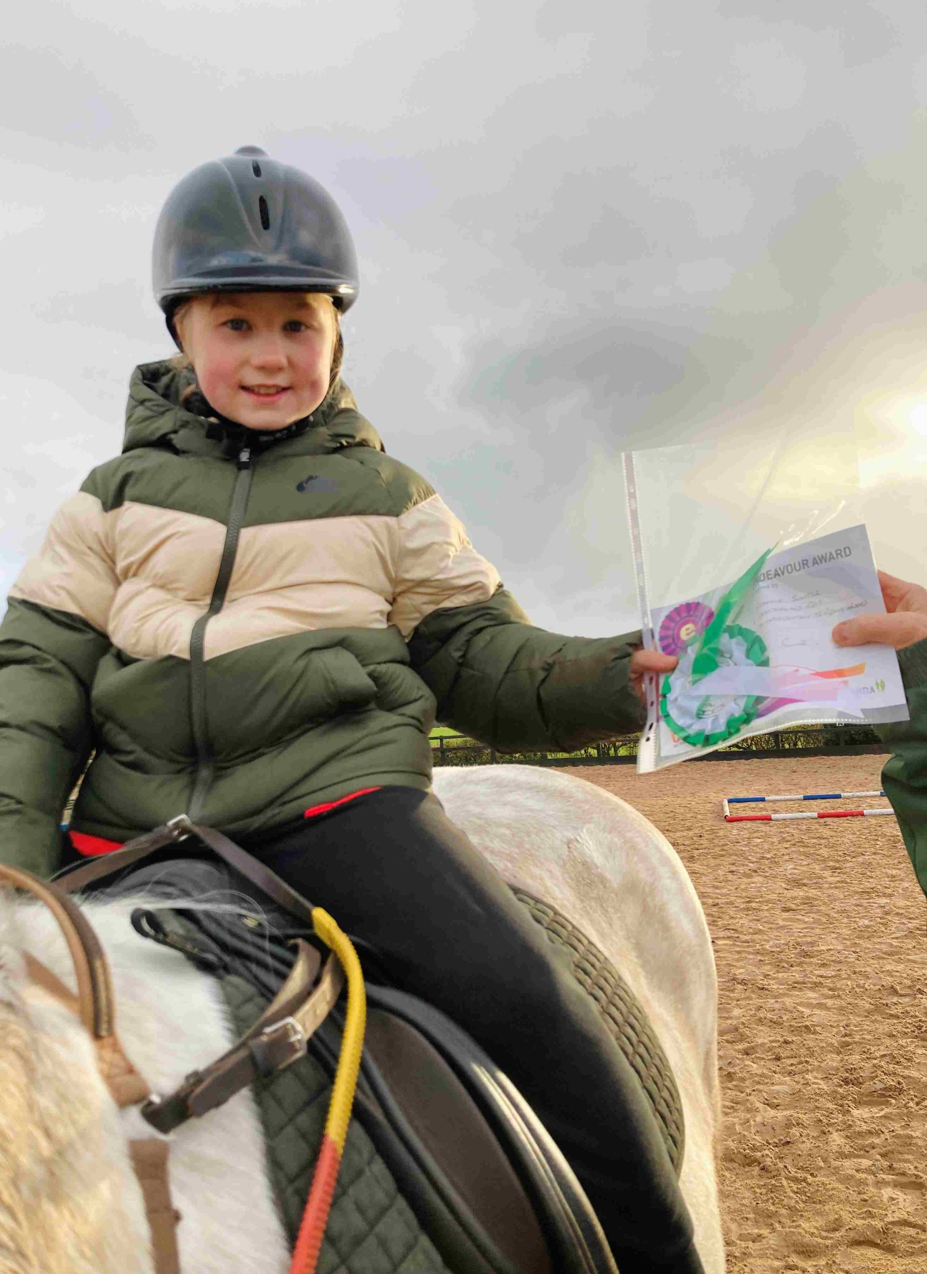 After their fun rides on Monday, 20 November 2023 our young riders were presented with awards and rosettes for their hard work and achievements over the term. Congratulations to all of them, including Esme’s dad who was presented with an Endeavour award for poo picking!