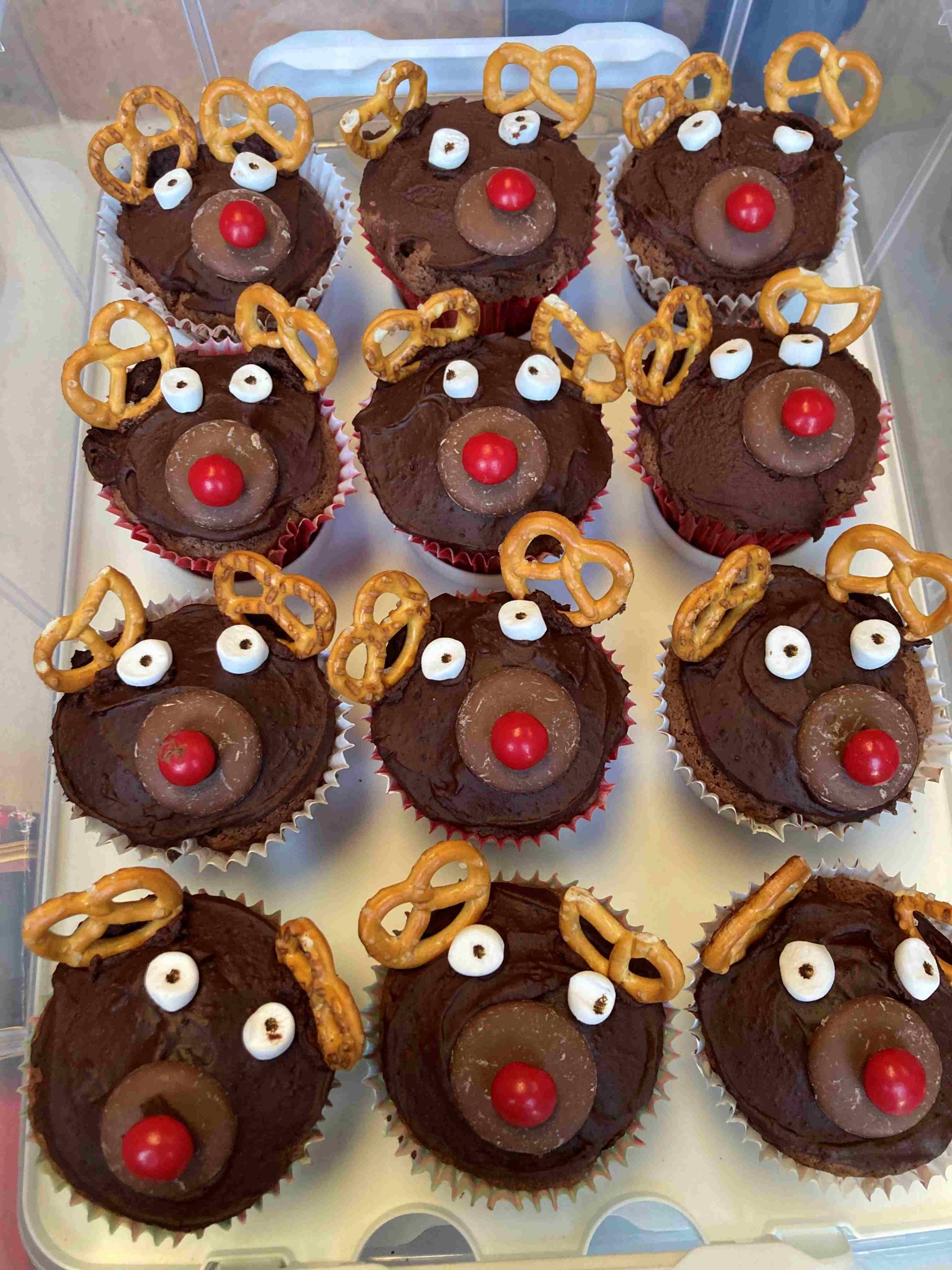 Unfortunately all our helpers were busy with ponies and riders and there was no-one available to photograph all this excitement. But we can show you a photograph of our volunteers celebrating the end of another excellent RDA year – with a reindeer bun for everyone!